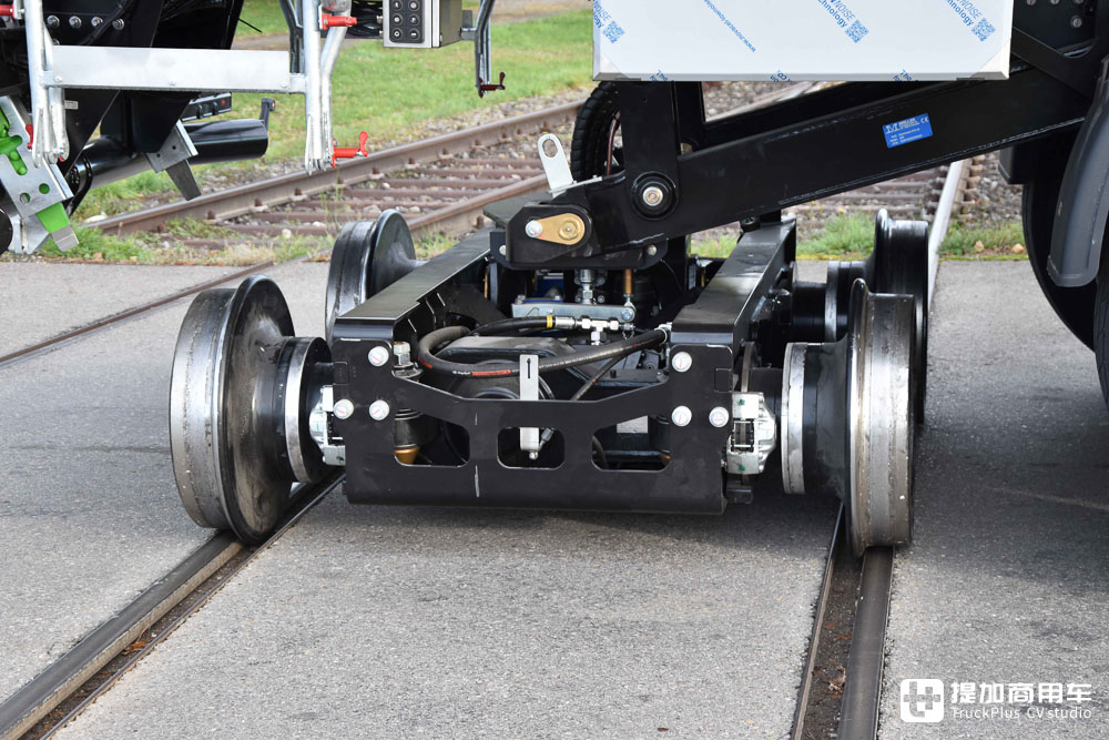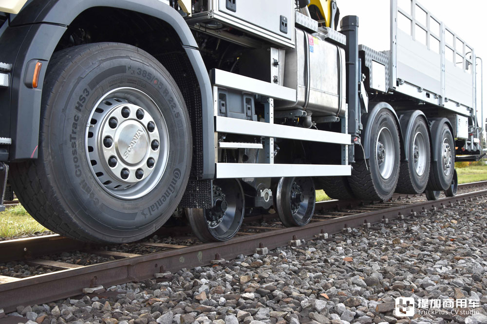 介绍完公路驱动部分及车身配置部分,接下来就让我们走进车辆的铁道走行部分。这两台斯堪尼亚G 500 XT的走行机构均由瑞士Müller Technologie AG公司提供,每台车配备2组走行系统。一组位于车辆尾部,一组位于车身中部,共同将车辆抬起。