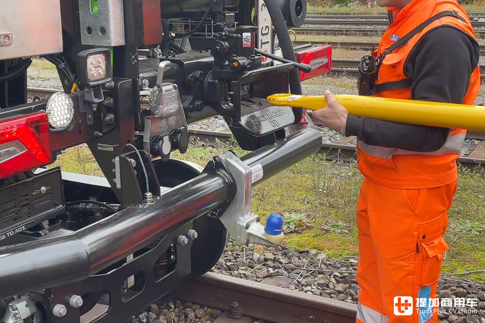 完成这一操作后,便可将车身前部的走行机构展开,将前轮也顶离地面。这时,车辆就具备在铁路上走行的能力了。