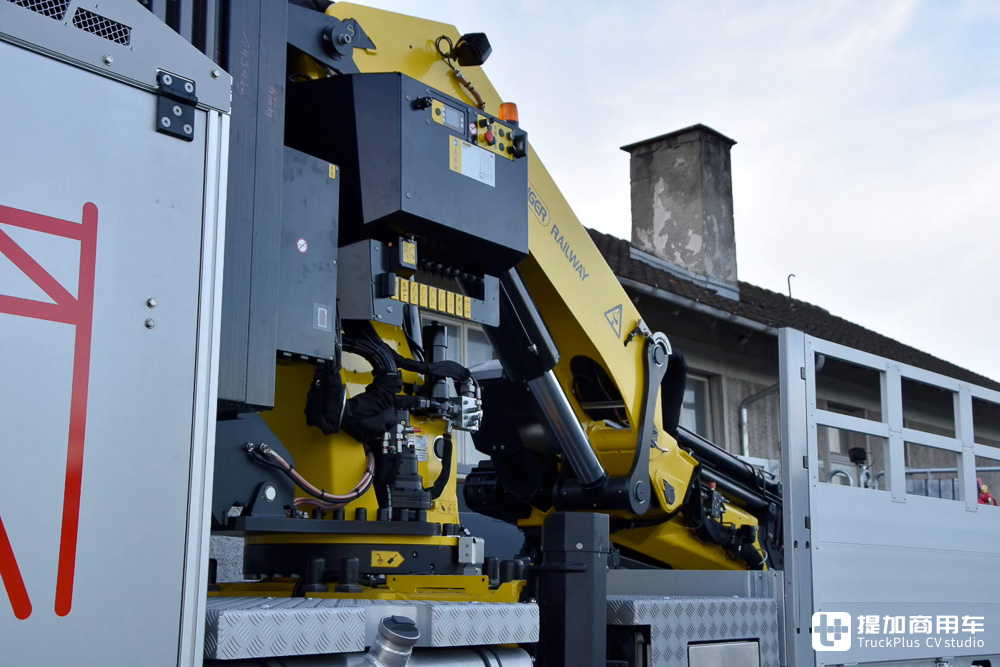 两车的起重机均由奥地利帕尔菲格提供,来自其旗下的铁道设备部门。与普通随车吊的不同之处在于:铁路用随车吊的绝缘性能更强,并且可根据用户需要来对精确性、调平能力等多种细节参数进行定制,能够匹配的属具也更多。