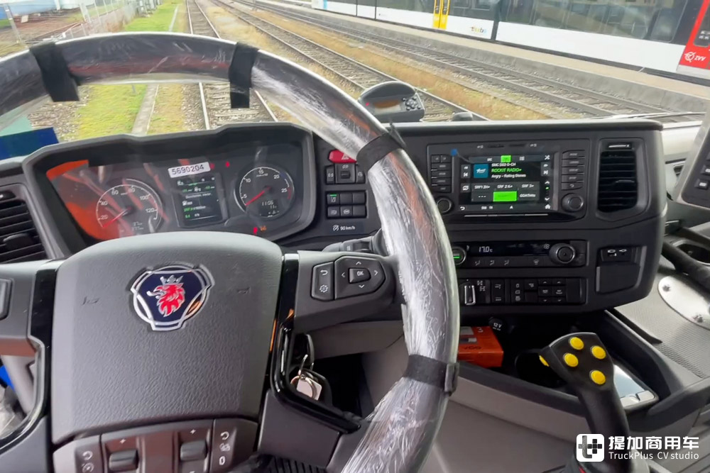 说到这,想必您一定很好奇车辆的内饰部分。从上图中我们可以看出:这两台斯堪尼亚G 500 XT的内饰组件和其他NTG代卡车基本毫无差别。即使车辆能够在铁路上行驶,但基础的操控组件还是一模一样的。