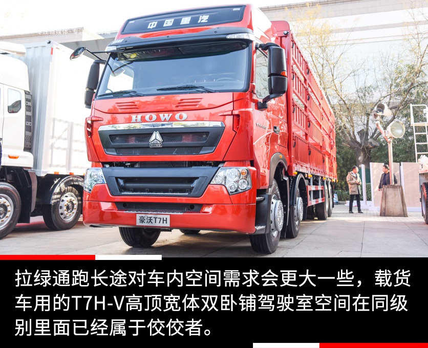 拉绿通跑长途对车内空间需求会更大一些,载货车用的T7H-V高顶宽体双卧铺驾驶室空间在同级别里面已经属于佼佼者。短途不需要大空间可以考虑T5G窄体驾驶室车型,自重还会更低一些。