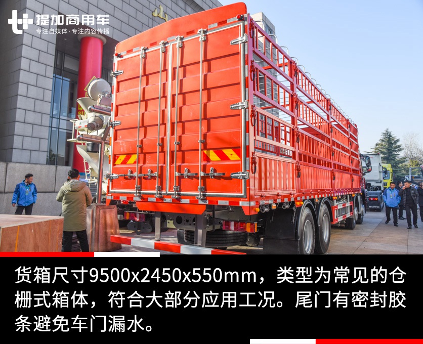 货箱尺寸9500x2450x550mm,类型为常见的仓栅式箱体,符合大部分应用工况。尾门有密封胶条避免车门漏水。