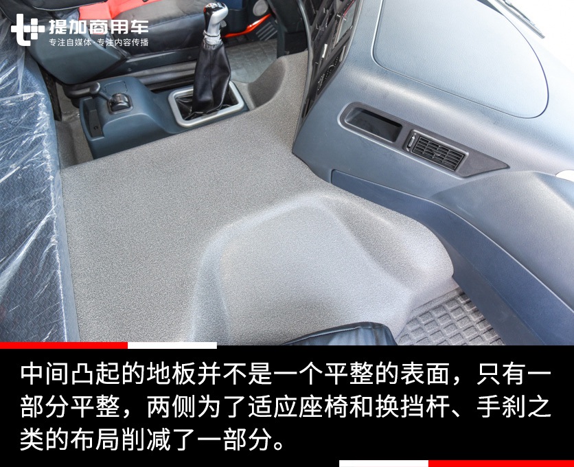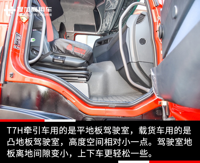 T7H牵引车用的是平地板驾驶室,载货车用的是凸地板驾驶室,高度空间相对小一点。驾驶室地板离地间隙变小,上下车更轻松一些。