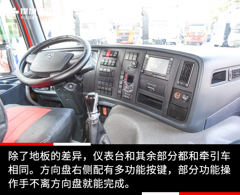 除了地板的差异,仪表台和其余部分都和牵引车相同。方向盘右侧配有多功能按键,部分功能操作手不离方向盘就能完成。