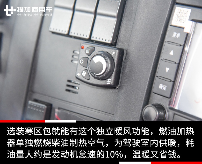 选装寒区包就能有这个独立暖风功能,燃油加热器单独燃烧柴油制热空气,为驾驶室内供暖,耗油量大约是发动机怠速的10%,温暖又省钱。