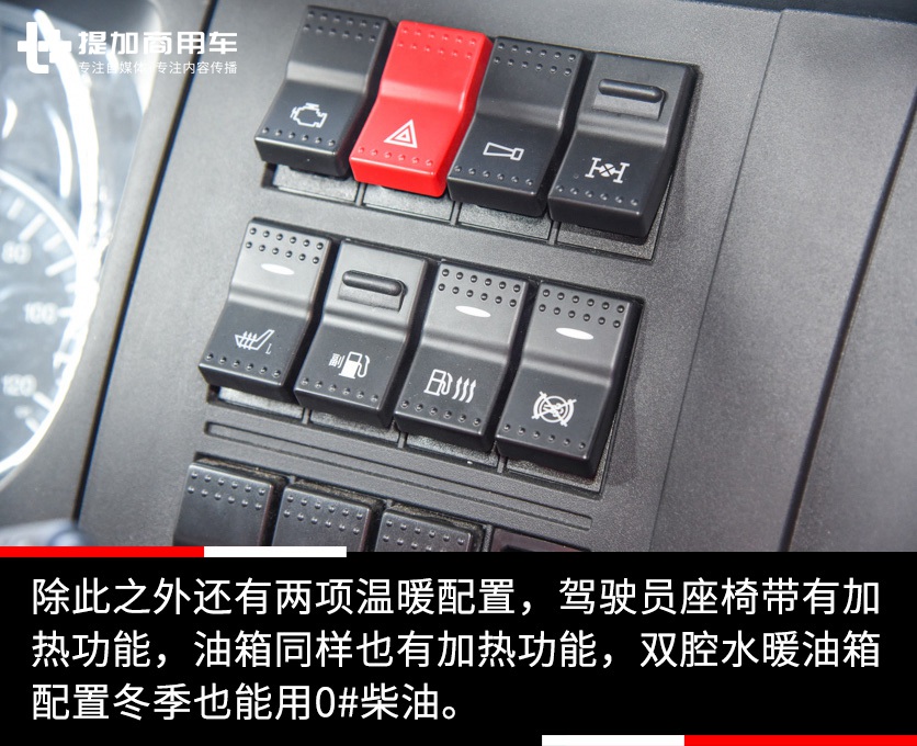 除此之外还有两项温暖配置,驾驶员座椅带有加热功能,油箱同样也有加热功能,双腔水暖油箱配置冬季也能用0#柴油。