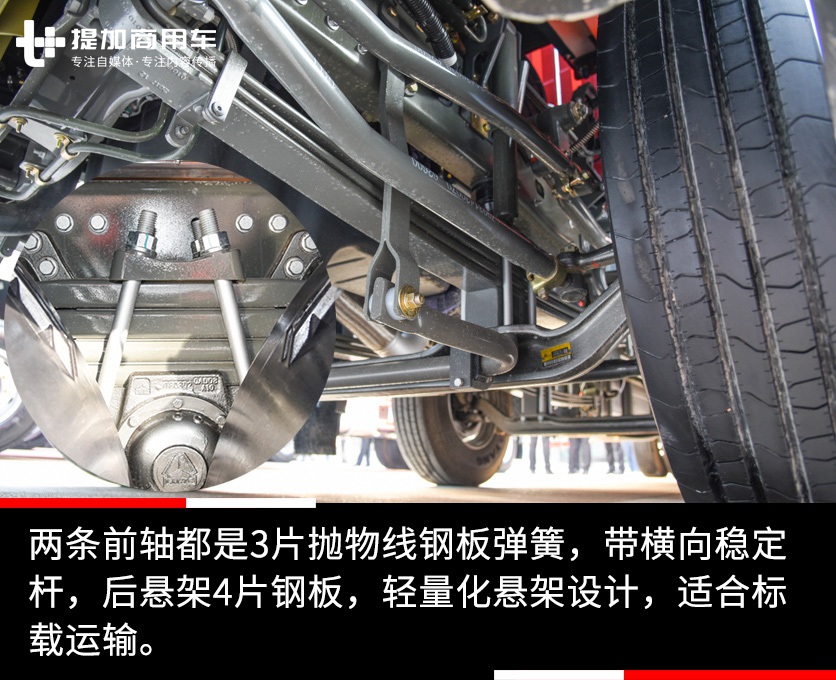 两条前轴都是3片抛物线钢板弹簧,带横向稳定杆,后悬架4片钢板,轻量化悬架设计,适合标载运输。