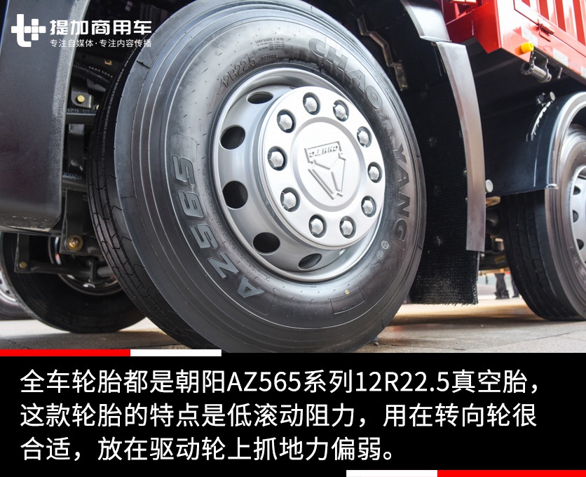 全车轮胎都是朝阳AZ565系列12R22.5真空胎,这款轮胎的特点是低滚动阻力,用在转向轮很合适,放在驱动轮上抓地力偏弱。