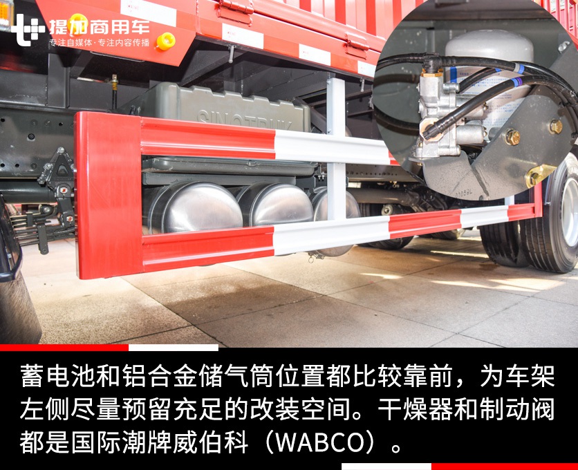 蓄电池和铝合金储气筒位置都比较靠前,为车架左侧尽量预留充足的改装空间。干燥器和制动阀都是国际潮牌威伯科(WABCO),细节配置没有缩水。