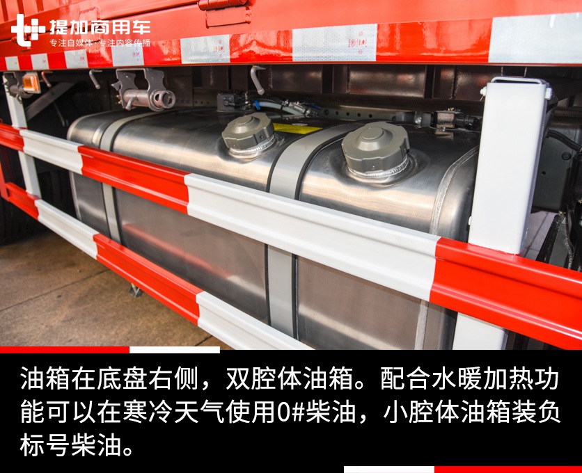 油箱在底盘右侧,双腔体油箱。配合水暖加热功能可以在寒冷天气使用0#柴油,小腔体油箱装负标号柴油,发动机启动和熄火前切换到负标号即可。
