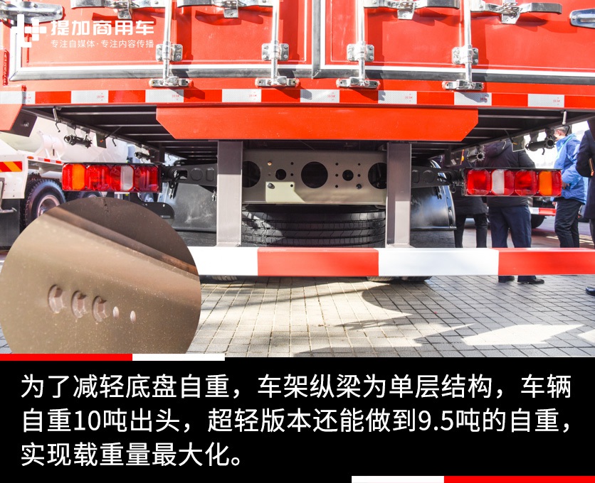 为了减轻底盘自重,车架纵梁为单层结构,车辆自重10吨出头,超轻版本还能做到9.5吨的自重,实现载重量最大化。