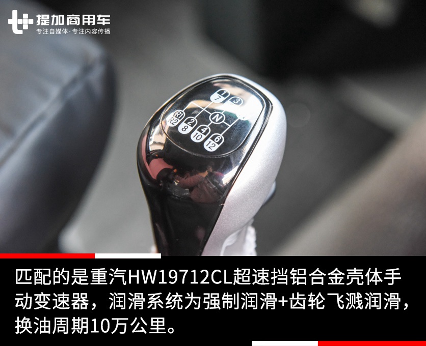 匹配的是重汽HW19712CL超速挡铝合金壳体手动变速器,润滑系统为强制润滑+齿轮飞溅润滑,换油周期10万公里。