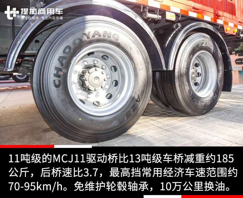 11吨级的MCJ11驱动桥比13吨级车桥减重约185公斤,后桥速比3.7,最高挡常用经济车速范围约70-95km/h。免维护轮毂轴承,10万公里换油。
