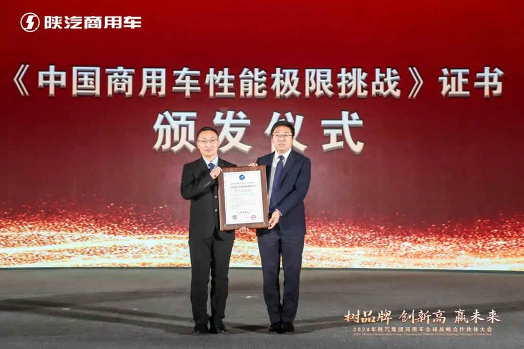 活动现场,中国商用车性能极限挑战组委会主任、中汽研汽车检验中心(武汉)有限公司党委书记、中国汽车工业协会专用车分会秘书长柳东威宣布延安S700在《中国商用车性能极限挑战》项目中挑战成功并现场为延安S700颁发证书。2024年1月10日,陕汽商用车延安重卡S700依据《CCVC货车高速综合燃料消耗量测试规程》模拟卡友高速用车最常用的高速工况,开展了81、85千米每小时综合油耗挑战。测试前,既定挑战目标燃油消耗量为百公里28L。经中国商用车性能极限挑战组委会审核,延安重卡S700燃油消耗量最终成绩为百公里26.97L,挑战成功!26.97L的成绩同时也创下CCVC数据库最佳经济节油类同类型牵引汽车高速综合最低油耗。