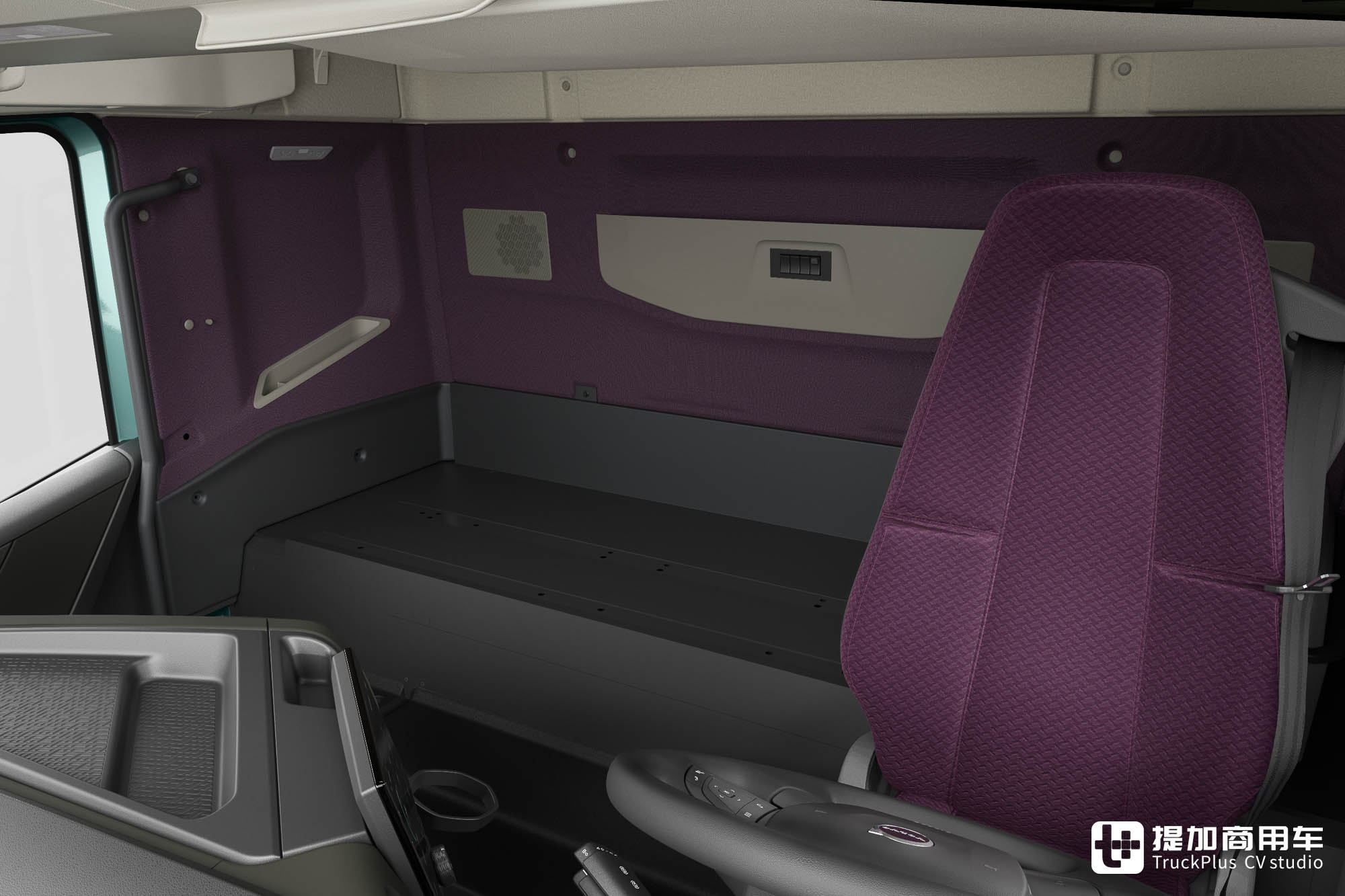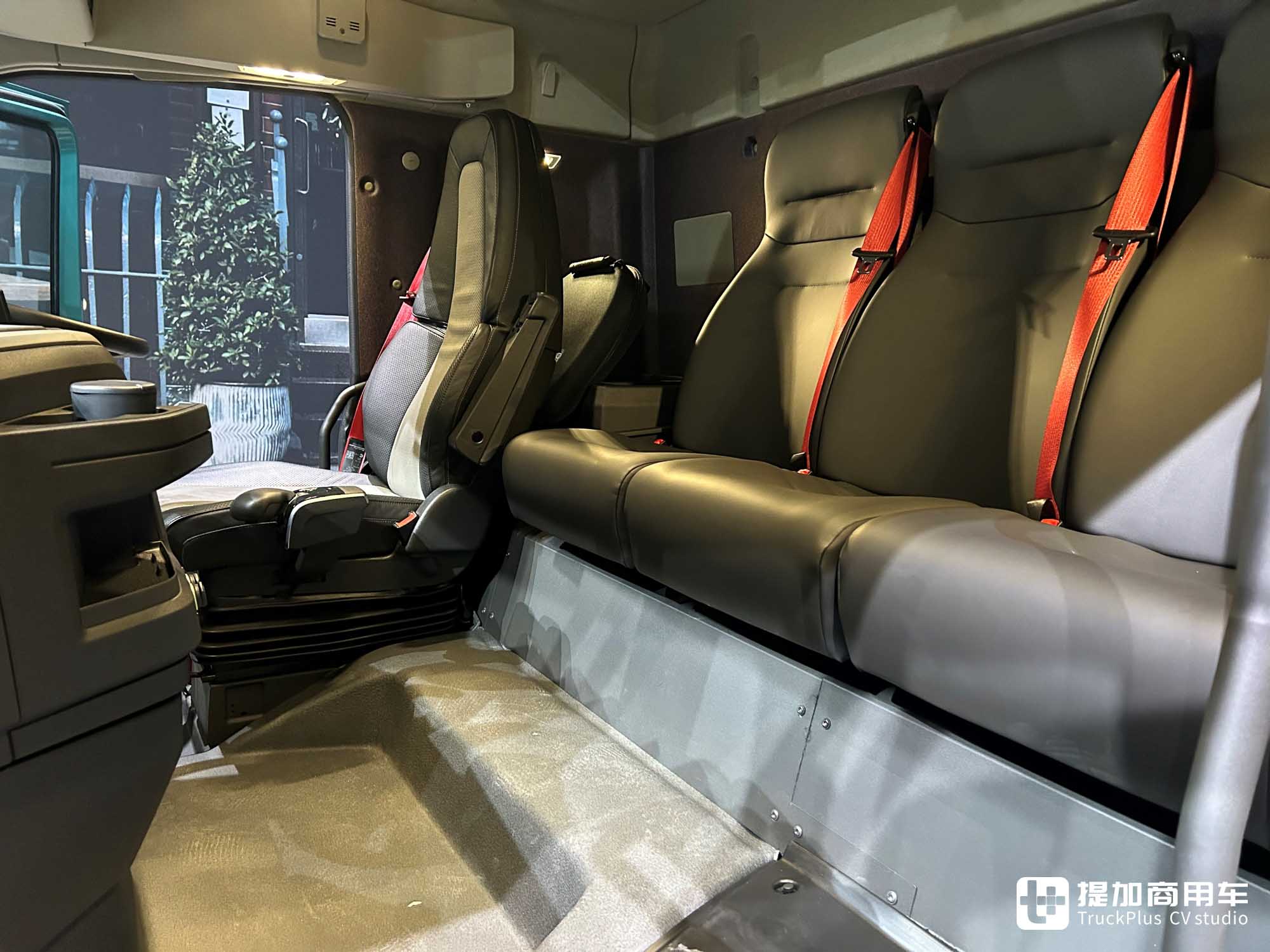 假如不选装座椅,那驾驶室后部就是一块平坦的区域,可用来放置各类物品。这块区域脱胎于带卧铺驾驶室的卧铺区域,用于短暂休息也不是不行。