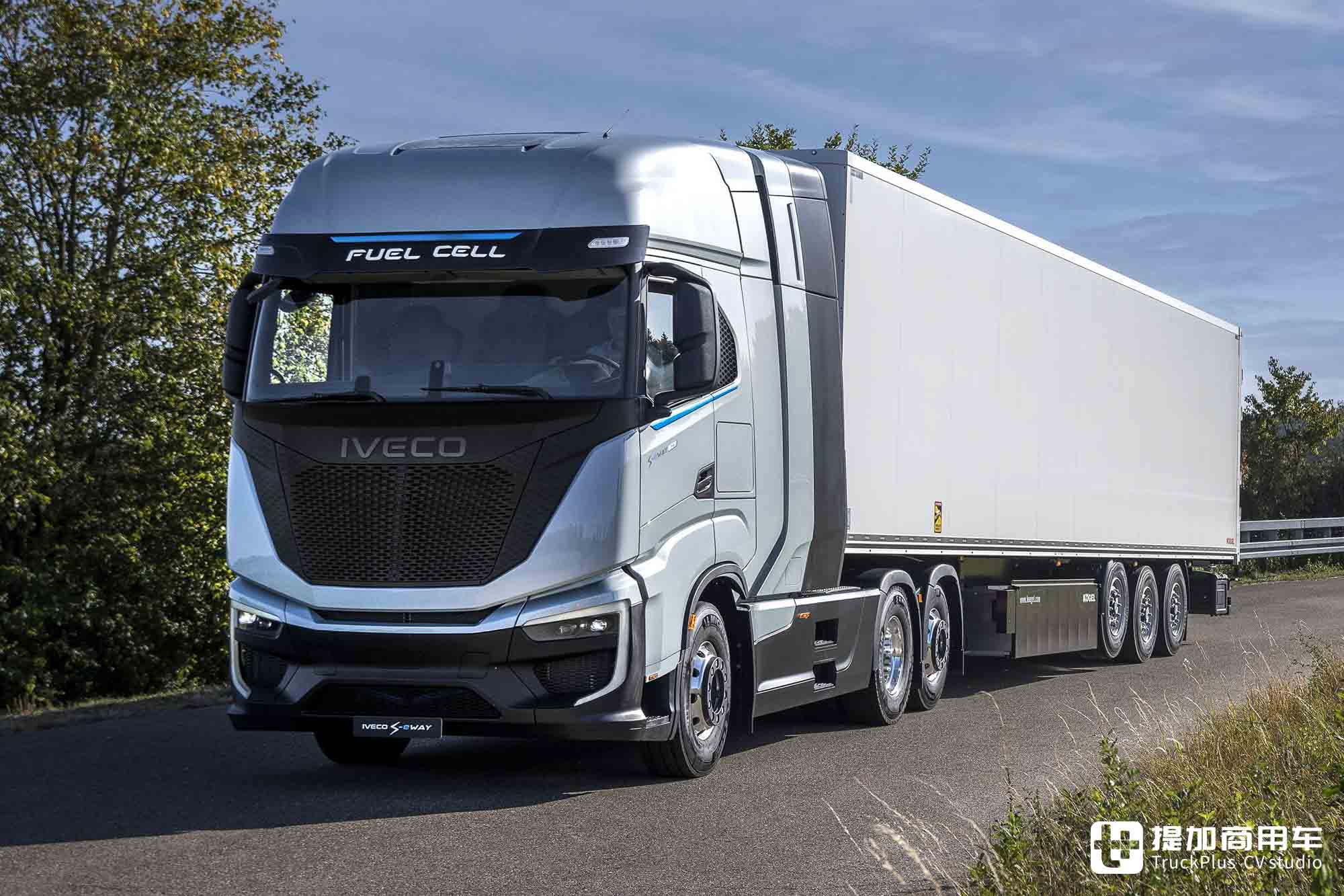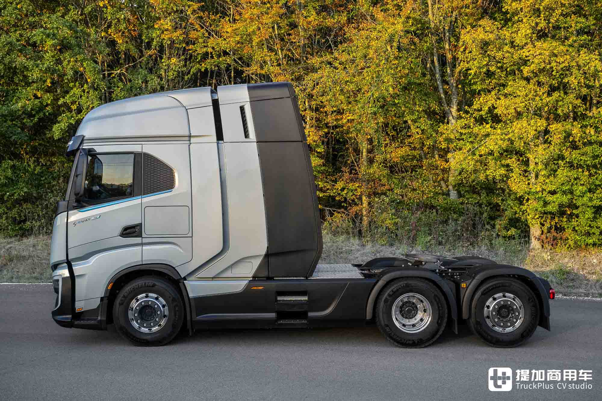典型车型就是依维柯的S-eWay FCEV氢燃料电池电动卡车。由于其车载设备较重,因此仅提供6x2长轴距底盘配置,氢气储罐安装在驾驶室后部,占据了1.5米左右的长度。为了满足相关要求,依维柯为车辆配备了大角度的尾桥转向系统,从而缩短转弯半径。即使车辆的总长高达18米,也能够合法的在欧洲道路上行驶。