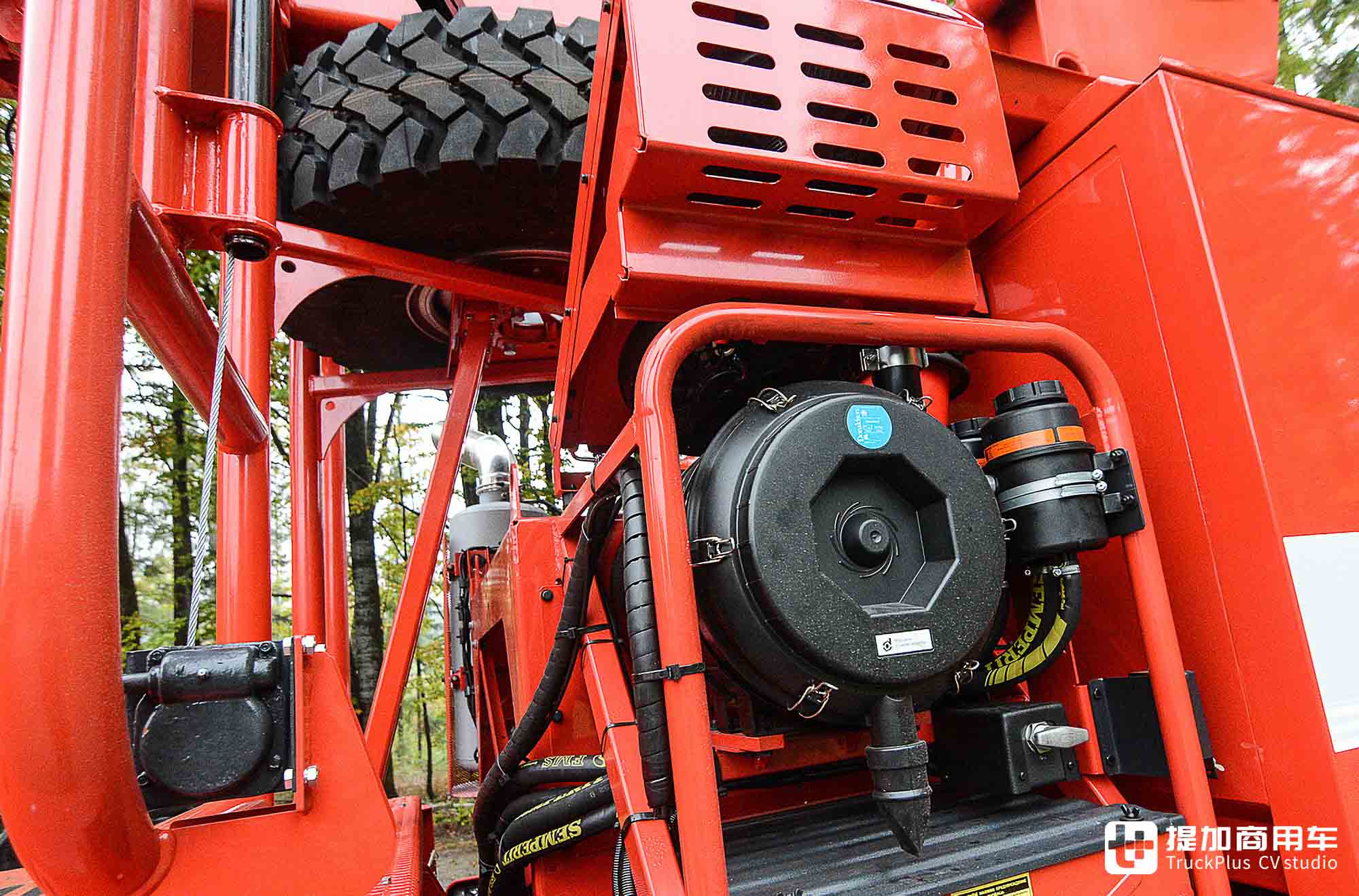 由于无需安装发动机水箱,因此驾驶室后部的空间被解放了出来,安装了空滤、挡车器、备胎等多种实用性配置。