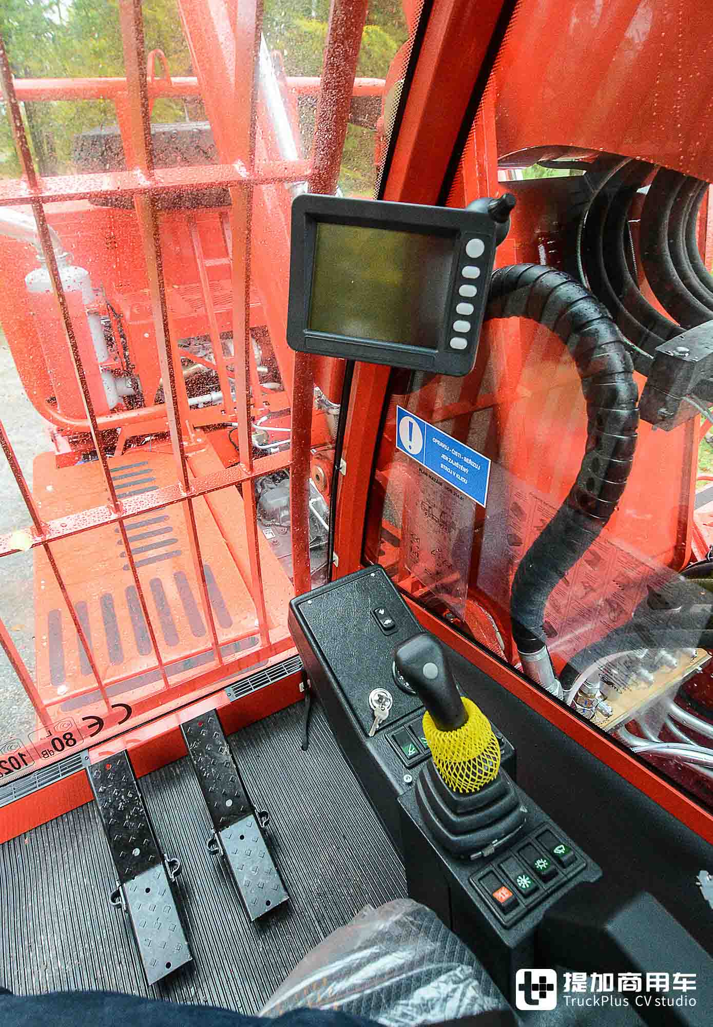 操作上装之前,先要将底盘上的支腿展开,保障驻车稳固,避免工作时翻覆。支腿的液压动力由上装搭载的约翰迪尔发动机提供,独立的液压回路设计保障了上装的工作可靠性,可脱离底盘部分来独立运作。