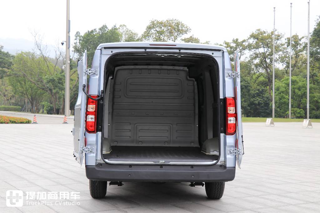 除了容积外,五菱扬光在装卸货便捷性上也给你考虑的明明白白,首先就是有一个270°开启的46式尾门设计。像这样的设计是目前新能源物流车最为实用的,它可以在复杂的环境下胜任装卸货工作,比如窄巷内可以只打开一扇尾门,靠 物流月台时能靠的更近一些,上下搬运货物也要比上开式尾门方便,且方便驾驶员理货码货。