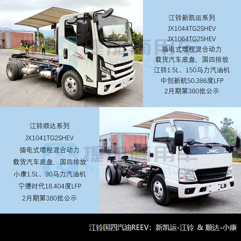 - 首先是颜值升级的江铃新凯运系列,申报有JX1044TG2SHEV和JX1064TG2SHEV两款插电式增程混合动力载货汽车底盘,均采用江铃1.5L、150马力汽油机,因GVW>3500kg而采用国四排放标准(N2/3类汽油动力排放标准自2013年后未再升级),电驱系统暂未透露,根据去年车展信息或为135kW电驱桥方案,搭载中创新航50.386度LFP动力电池,最高100km/h。由于我国早年引进五十铃轻卡的参数设置,最大总质量有4495kg蓝牌轻卡或6495kg大轻卡两种规格,车宽2025mm、准乘3人,均采用3360mm轴距,可选七组板簧悬挂,后者增加一组后轮距、2.2米车宽以及准乘2人方案。另后者暂未有同期整车申报,而前者共有栏板/厢运/仓运基本型及冷藏版四款基础变型车,以栏板车为例,标准4.2米货箱栏板,额定载质量1495/355kg,油耗8.1L/100km。