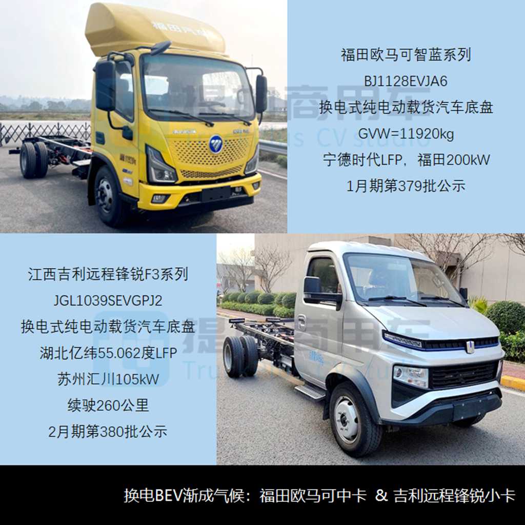 - 北汽福田1月期第379批公示申报了欧马可智蓝系列BJ1128EVJA6换电式纯电动载货汽车底盘,是业内为数不多的6-14吨换电式中卡车型(可见的另两款为2022年10月期宇通集团10吨和去年7月期江淮骏铃V系7吨,均采用江苏远景单体、江苏全程电成组LFP动力电池)。该底盘GVW=11920kg,车宽2330mm、准乘3人,轴距3860mm,可选两组板簧悬挂,搭载宁德时代LFP动力电池,福田200kW电驱系统,与厢运车同期申报公告,全长7055mm、货箱长5200mm,额定载质量6475kg,最高90km/h。