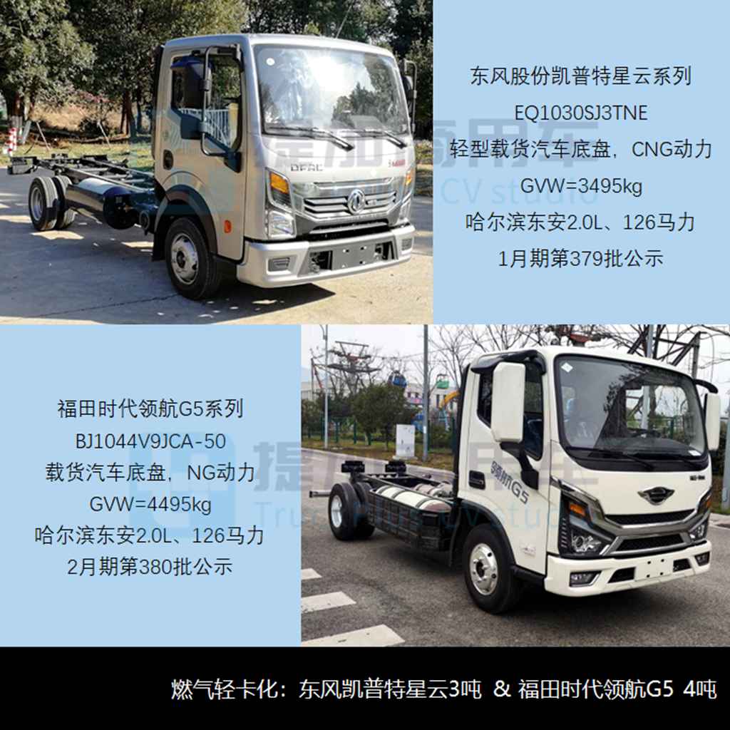 - 北汽福田2-3月期申报了六款相关载货汽车底盘新品,覆盖四条产品线且各有特色:4吨级奥铃BJ1045V9JCA-AB1搭载成都云内3.0L、129马力气体机;4吨级时代领航G5系列BJ1044V9JCA-50搭载昆明云内2.0L、150马力气体机;4吨级祥菱M系列小卡BJ1042V9A/JC6-07采用双/单排驾驶室,相当于加强型小卡,搭载柳机五菱2.0L、122马力气体机;以及3吨级时代领航S1系列BJ1035V4A/JC6-30,采用双/单排驾驶室,搭载哈尔滨东安2.0L、127马力气体机。作为轻卡(含小卡)行业的龙头企业,福田对该市场经营许久、对需求理解深刻,本次发展燃气车型也表明了市场端依然存有刚需。