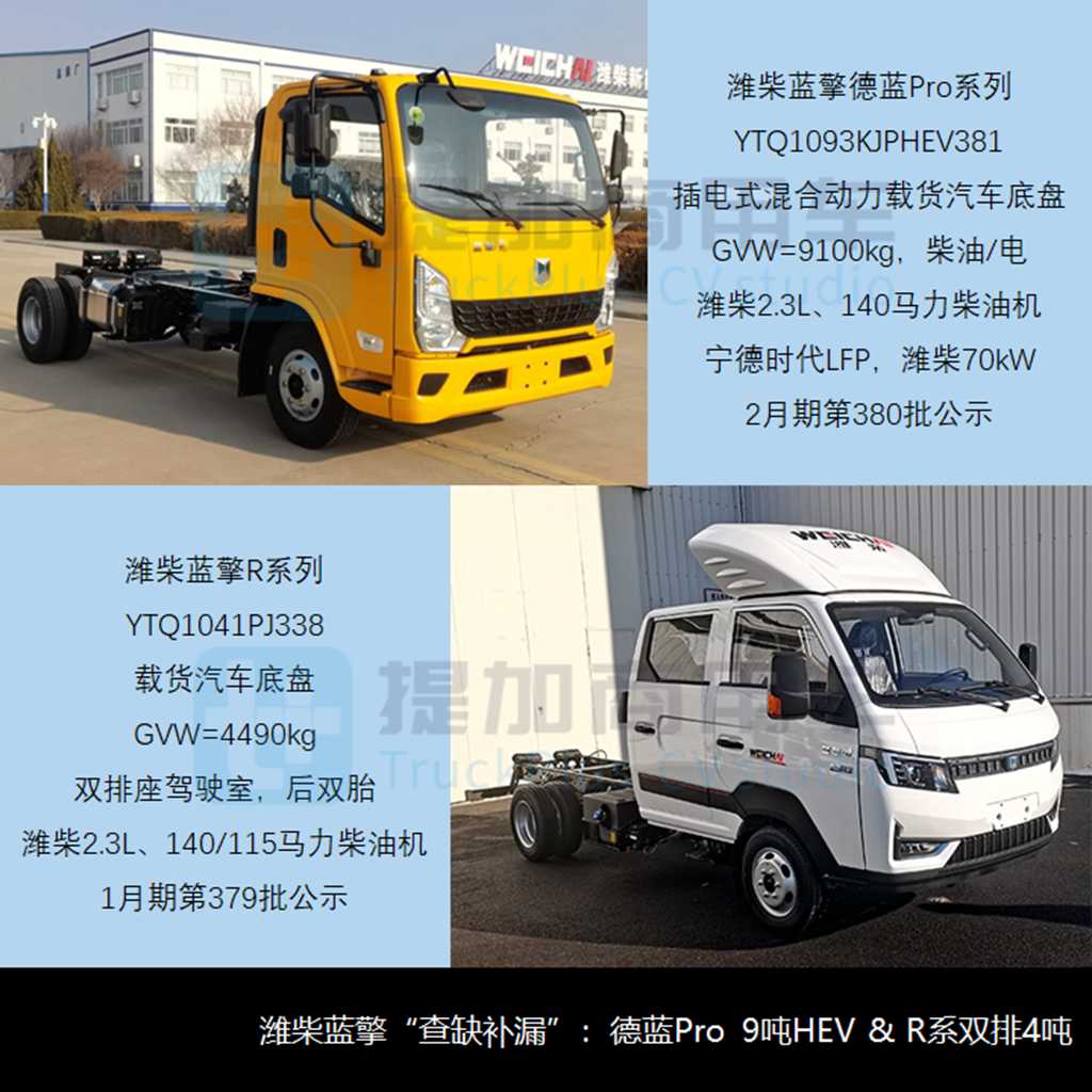 - 2月期第380批公示申报了潍柴蓝擎德蓝Pro系列YTQ1093KJPHEV381插电式混合动力载货汽车底盘,GVW=9100kg,车宽2190mm、准乘2/3人,轴距3800mm,可选八组板簧悬挂,匹配潍柴2.3L、140马力柴油机,搭载宁德时代LFP动力电池,潍柴70kW电驱系统,最高100km/h。该底盘是在4.5吨同类车型基础上加长轴距、变更轮胎规格及GVW、加装前下防护装置而成,三电系统不变,也是业内目前唯一可见的9吨级HEV底盘。