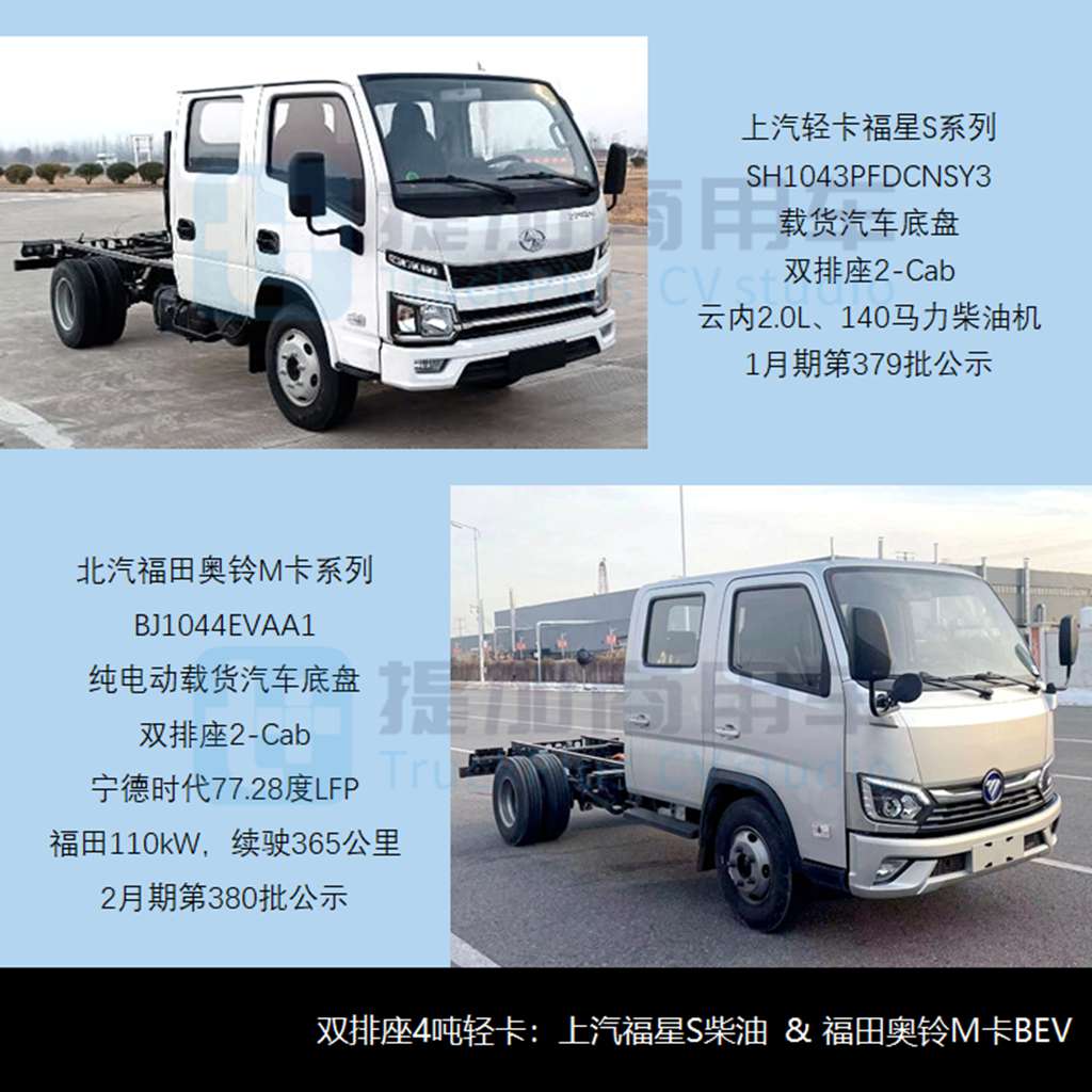 - 北汽福田2月期第380批公示申报了奥铃M卡系列BJ1044EVAA1纯电动载货汽车底盘,车宽1970mm属宽体范畴,但产品定位于针对蓝牌新规、4米2以下的经济型多面手小卡,驾驶室形置同上款,轴距3360mm,前3片、后5+2片板簧结构,搭载宁德时代77.28度LFP动力电池,福田110kW,有栏板/厢运/仓运三种基本型整车,最高90km/h,续驶365公里。随着奥铃M卡和欧马可X系列的推出,福田的“小轻卡”型谱也有了新的组合方案。