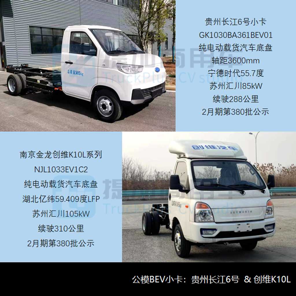 - 贵州长江作为贵安新区控股企业,前身为民用改装类(二十三)01号的贵州客车制造厂,2022年12月工信部第366批升格为第208号的整车生产企业,同时增加BEV货车生产资质。2月期第380批公示,其申报了长江6号小卡GK1030BA361BEV01纯电动载货汽车底盘,利用开瑞小象X系列白车身资源,轴距3600mm,搭载宁德时代55.7度动力电池,苏州汇川85kW电驱系统,最高80km/h,续驶288公里。