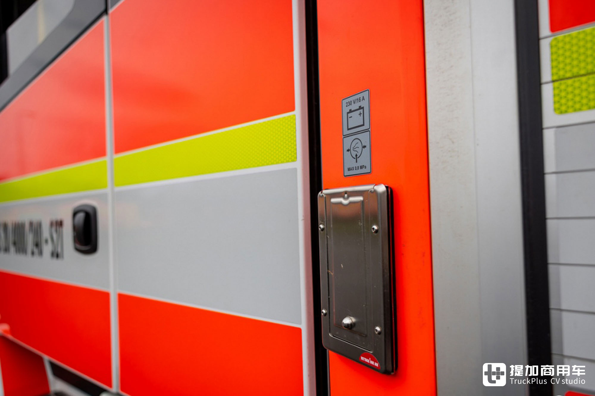 同时,车身侧面还安装有自动弹射插座,可连接外部电源和气源,来为车辆蓄电池充电、储气筒充气,保障车辆正常启动及刹车。当车辆启动后,插座会自动将电线及气管弹出,提升了出警效率,同时避免忘拔线缆造成的事故。