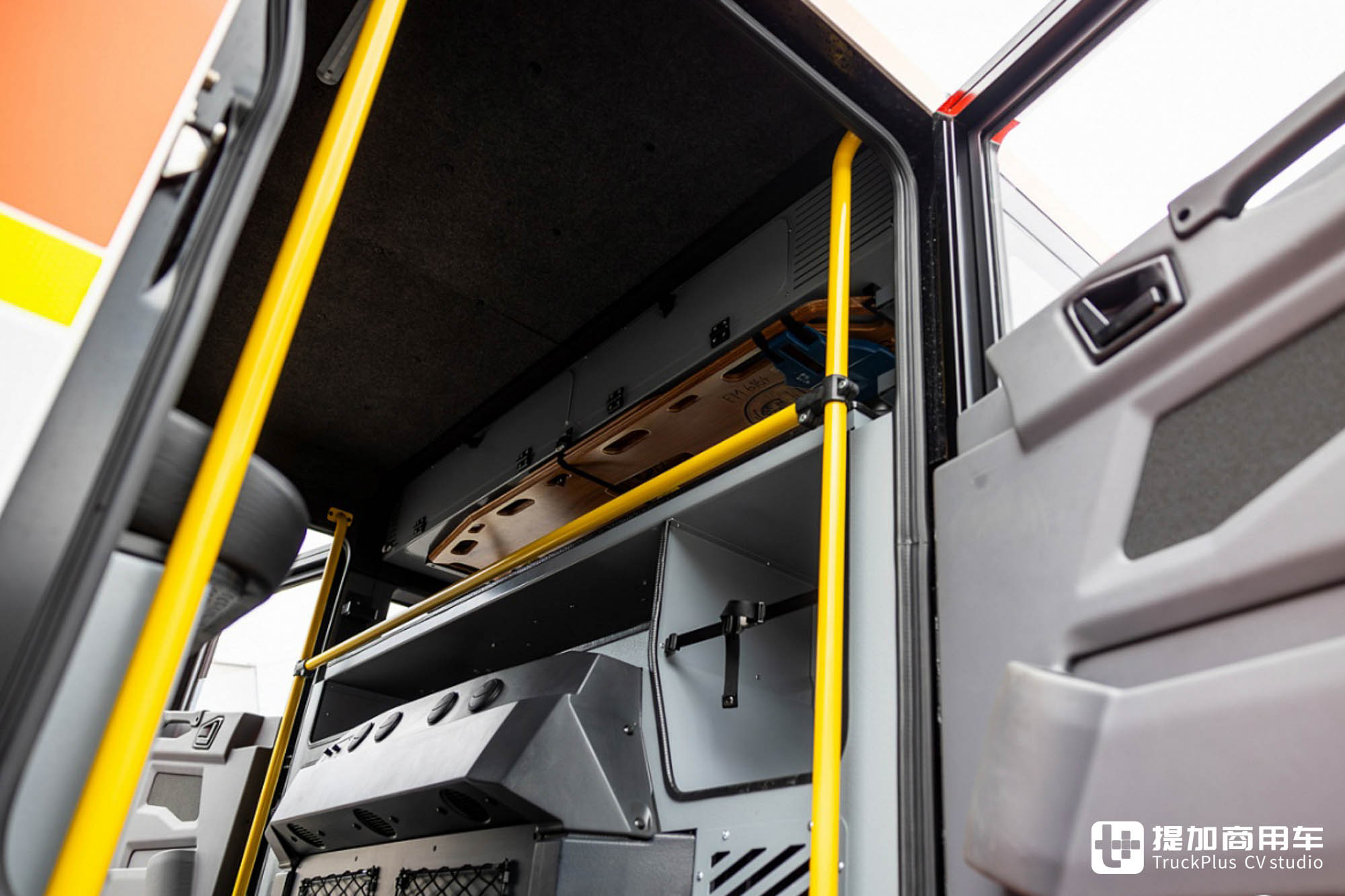 接下来,就让我们来说说驾驶室:第三代太脱拉Force的双排座驾驶室为重新设计,其长度达3.45米,可为内部乘员提供充足空间,便于穿戴空气呼吸器等装备。
