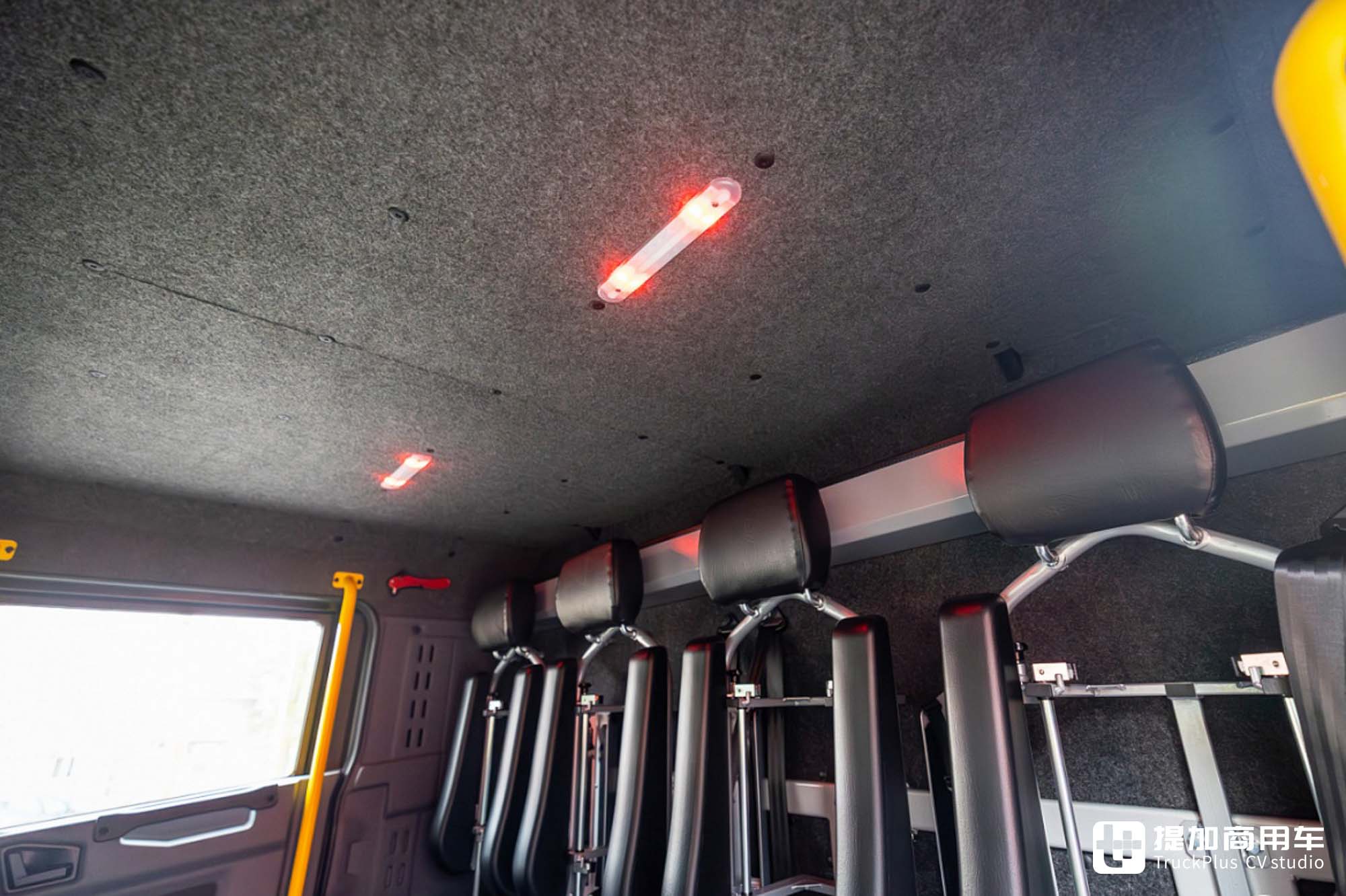 前排安装有两张座椅,供主副驾驶就座。后排并排安装了四张空呼座椅,车内总共可容纳6人。空气呼吸器可放置在靠背处的凹槽处,与更长的驾驶室空间匹配,更便于消防员穿脱装备。