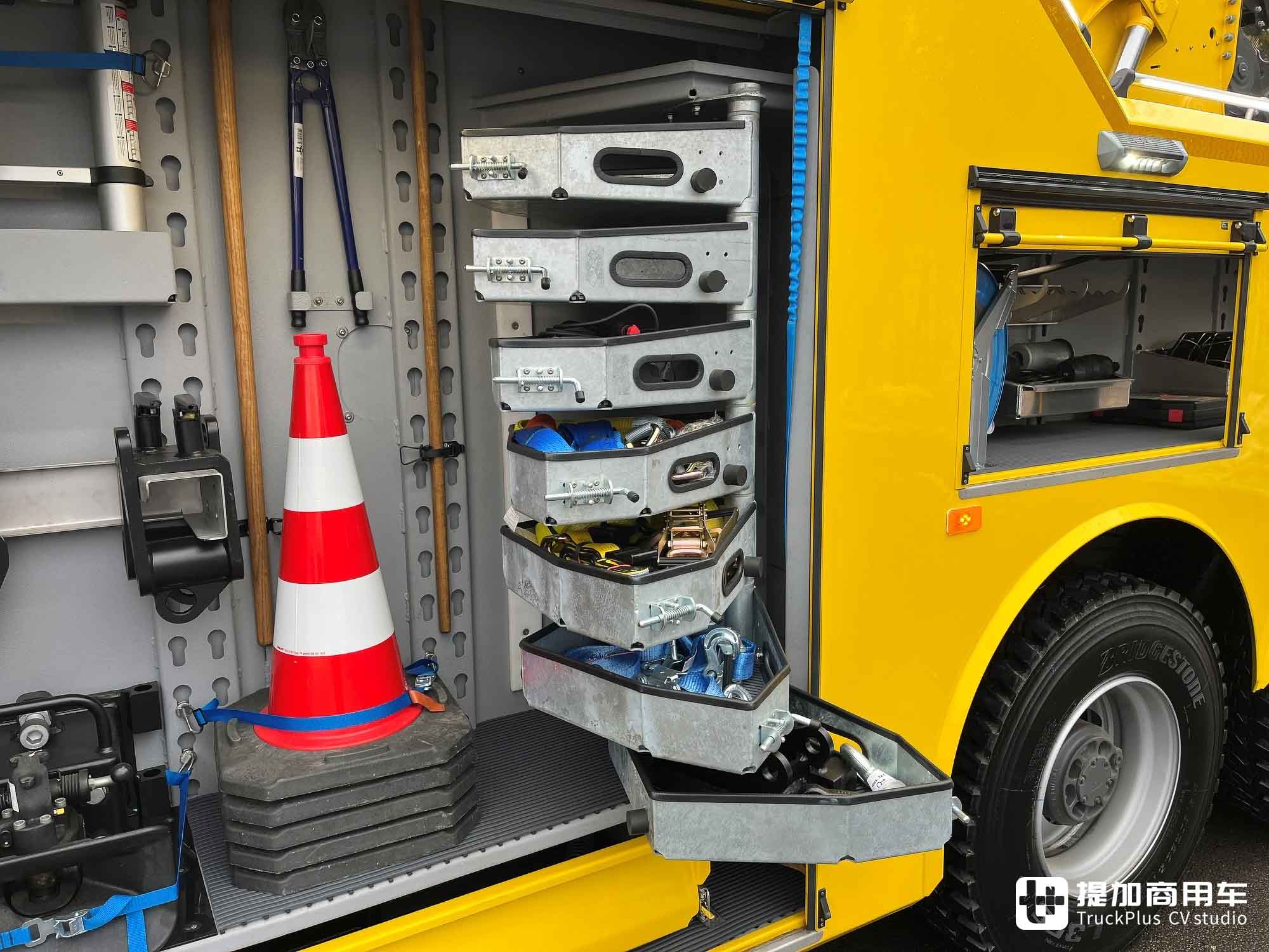 本车采用的上装具体型号为EH/W 200 Bison Typ 4,这也是该系列上装中尺寸最大、配置最丰富的款式。安普为车辆设计了山峰般的大型储物柜体,安装在车身左右,将拖臂夹在中央。储物柜体内带有多个大型储物箱,放置各类清障相关设备,例如雪糕筒、绑带等。