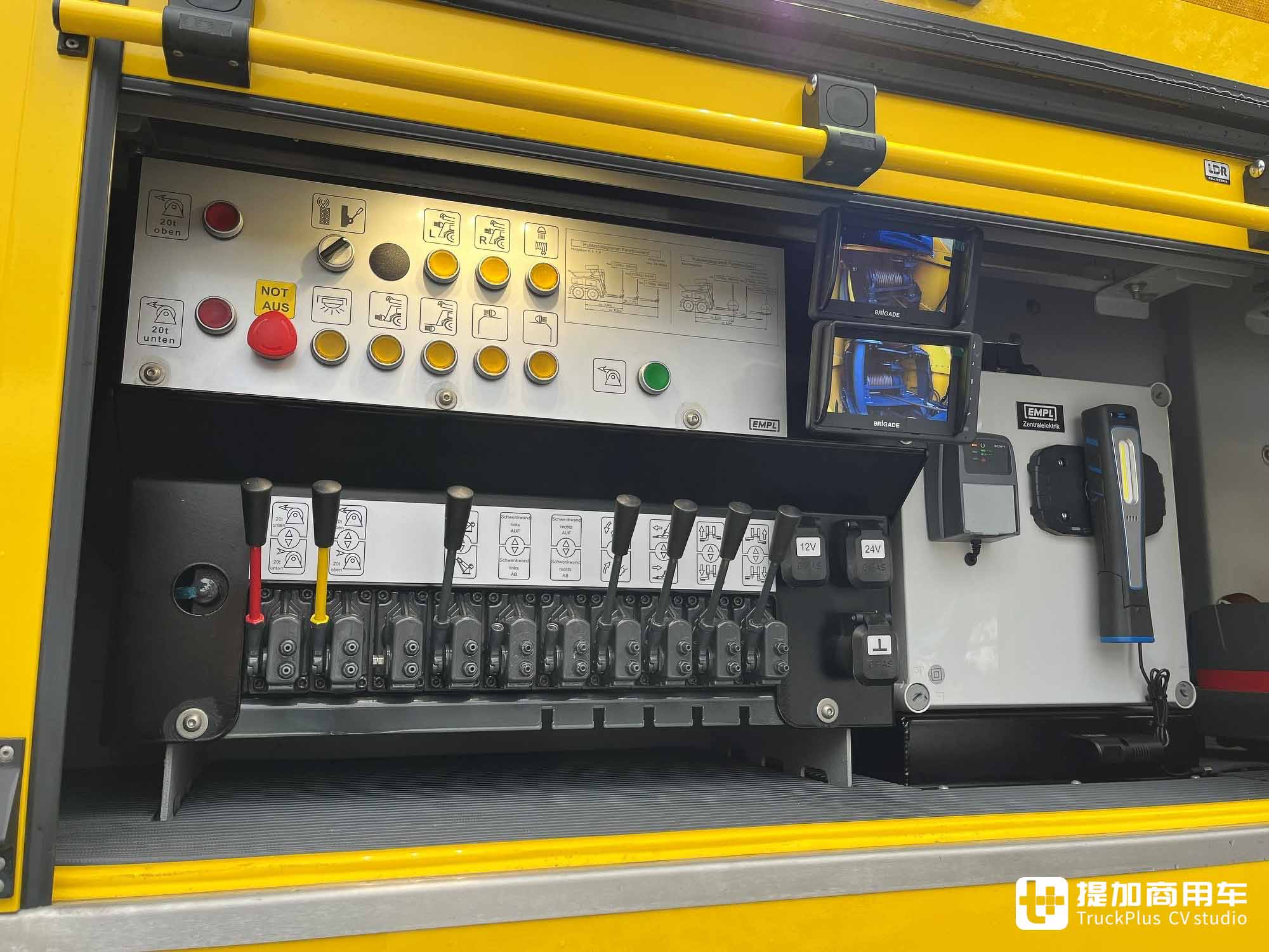 储物箱采用中锁设计,可一键控制开闭,提升效率。机械控制面板被设计在车身右后方的储物箱内,并集成有车身摄像头屏幕等设备。除了在控制面板处操控外,还能够通过无线电遥控器控制。工作人员可远离车辆进行控制,安全性更高,并且能够更好的掌控全局。