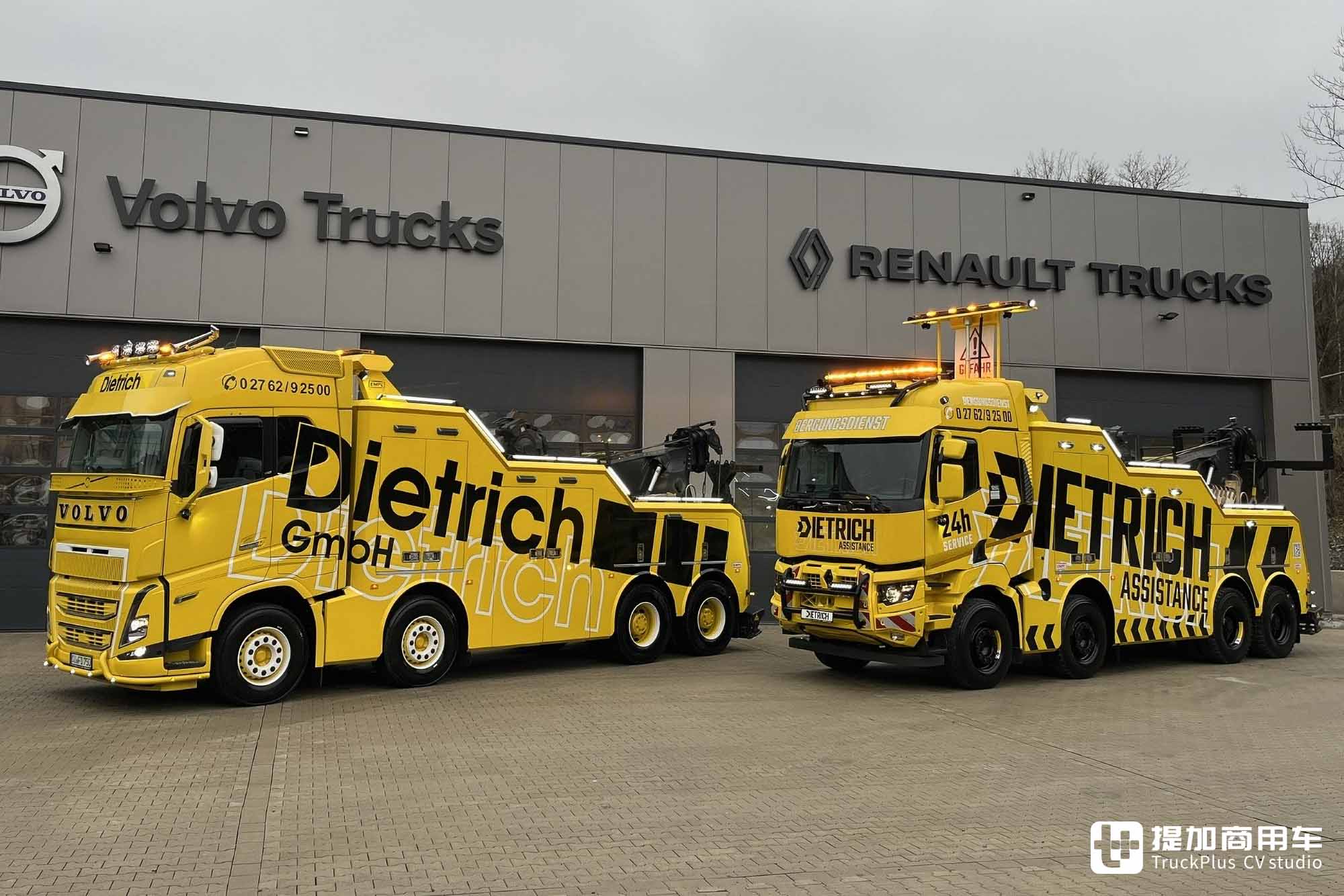 除了销售卡车之外,Dietrich也提供道路救援、卡车运输等牵引、清拖相关的服务。这些业务的开展需要清障车、平板车等专用车辆支持,而雷诺、沃尔沃等品牌的卡车自然成为了首选。毕竟是自己代理的品牌,有什么理由不用呢?