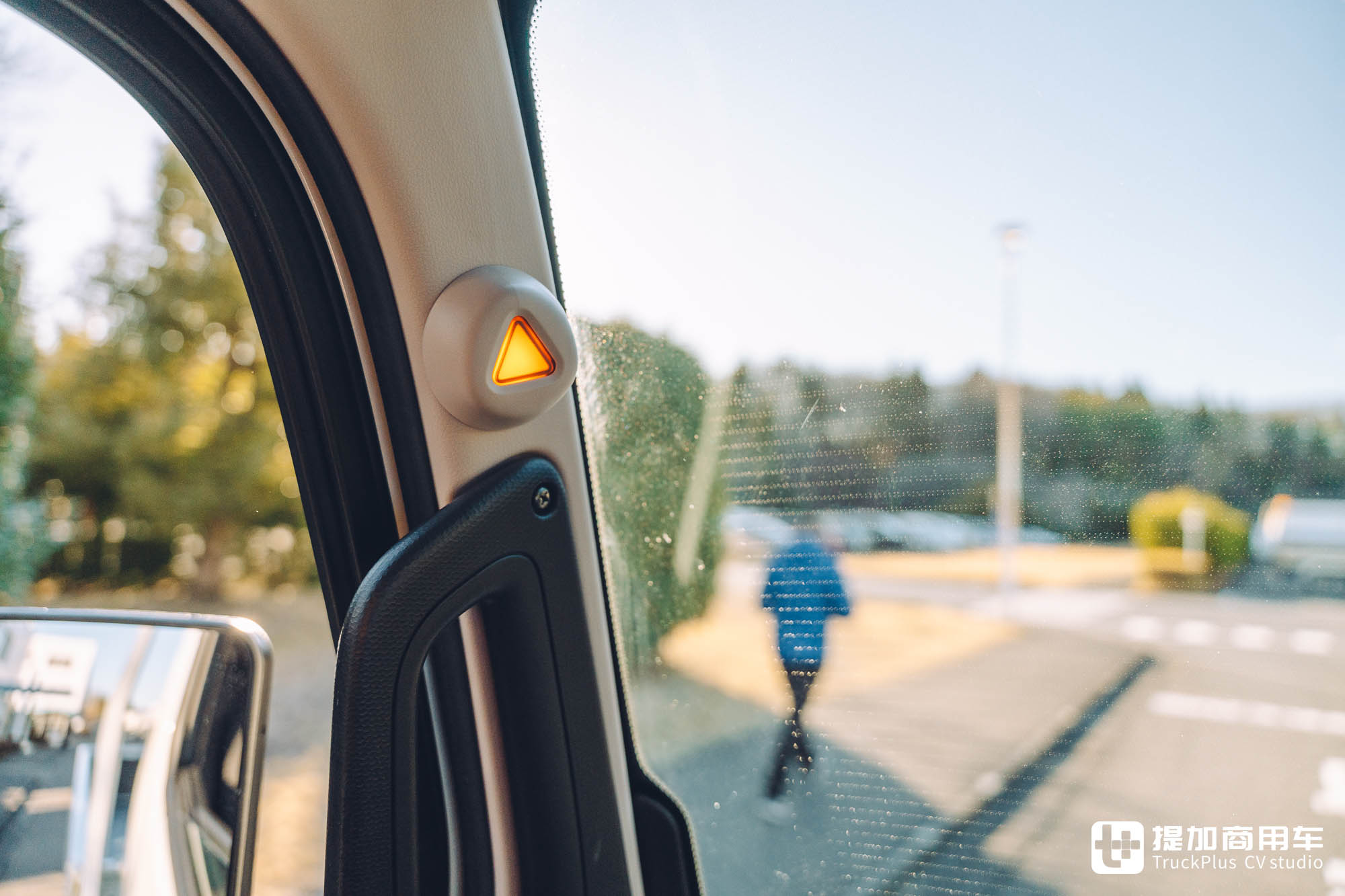 在侧面盲点雷达等四个传感器的支持下,改款三菱扶桑Canter轻卡搭载了BSIS盲点信息系统。它能检测盲点区域及区域外的其他道路使用者,并向驾驶员发出声光警告。当检测区域内存在障碍时,A柱上的黄色三角形警告标志将亮起,起到提示效果,避免变道、转弯时的潜在事故。