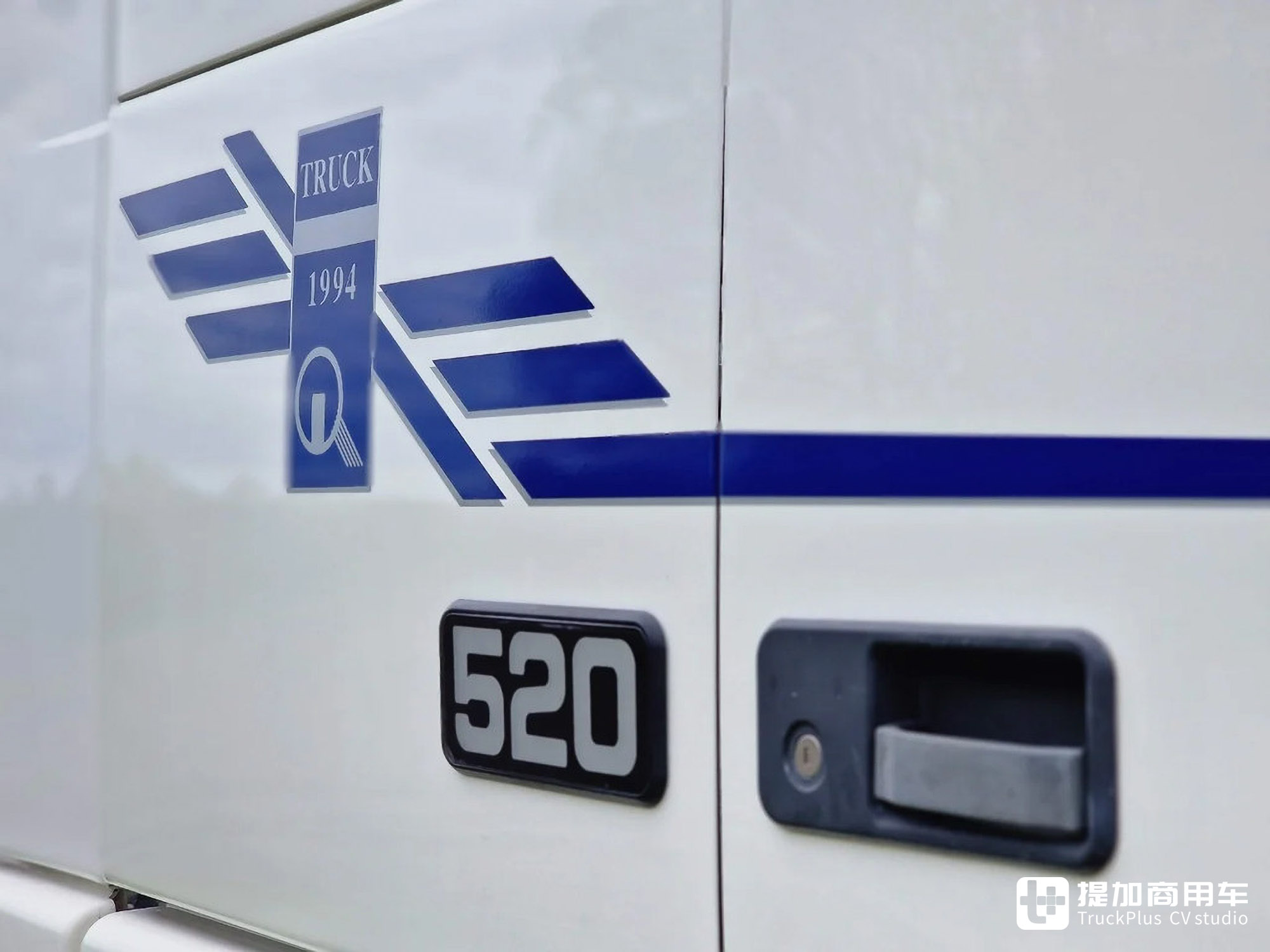 纯白的涂装为人们留下了无数的遐想空间,如画布一般代表者无限可能。在驾驶室侧面,除了标准的520字样马力标牌之外,还有1994年国际年度卡车的骄傲标识。与羽翼一般的蓝色拉花相匹配,更显车辆的别具一格。