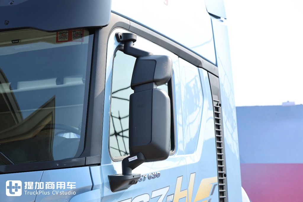 相较于国内重卡大部分副镜在下的结构,我还是更喜欢豪沃TS7-H副镜在上的布局,盲区镜的观测会更加便捷,眼睛余光就能瞟到,而且镜片还是大曲率的设计,像长途物流拖大宽箱也能看的清清楚楚。值得一提的是,豪沃TS7-H的主副镜均带有电调节和电加热功能,极大地方便了用户观测后方状况。