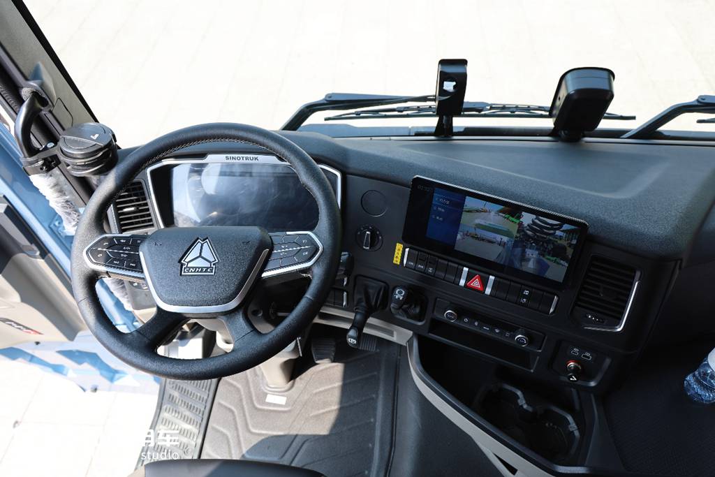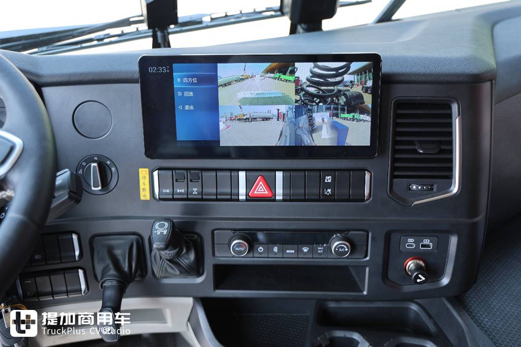 工作台区域配置丰富,上方12.3寸液晶大屏集成蓝牙电话、车机互联、导航、四方位影像等功能,豪沃TS7-H还可以支持360°环影,可进一步减小车辆盲区。