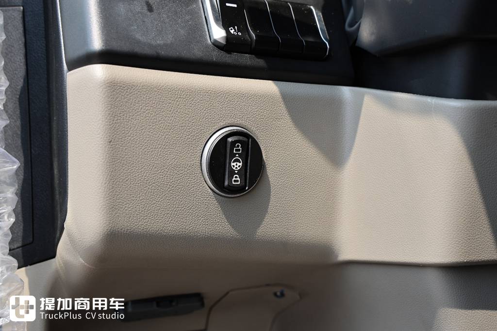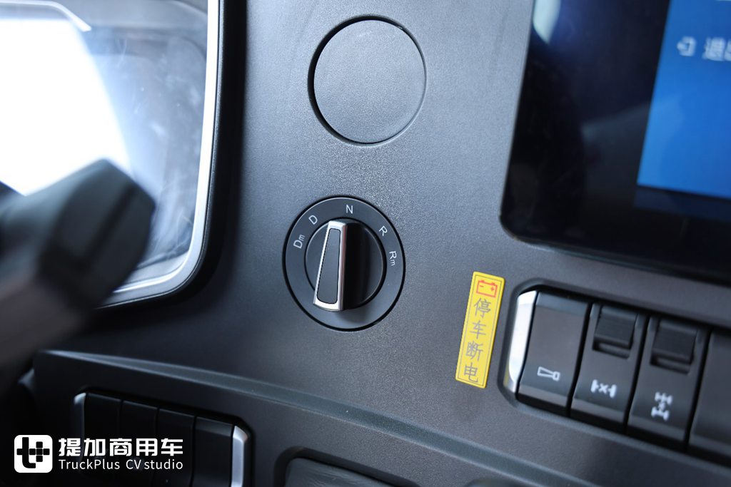 换挡机构采用旋钮式换挡,手动加减挡的操作则是集成与方向柱右拨杆位置,同样是伸手就能操作的位置。可以看到在旋钮换挡机构上方还预留有一键启动的开槽,说明未来豪沃TS7-H还将支持一键启动与无钥匙进入功能。