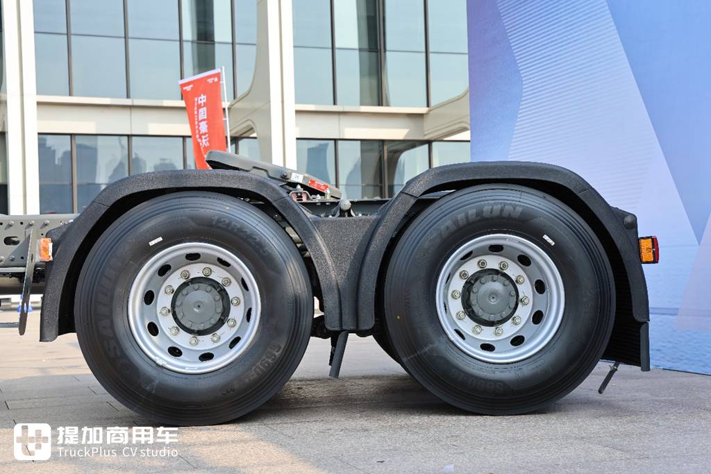 后桥匹配曼技术MCY12单级减速桥,速比2.71和2.85两种,像这种大马力直接挡小速比的搭配就是天生为高效物流而生。在轮胎方面,豪沃TS7-H匹配的是12R22.5的赛轮液体黄金真空胎,如果说速比再小一点的话应该还会配295的胎。