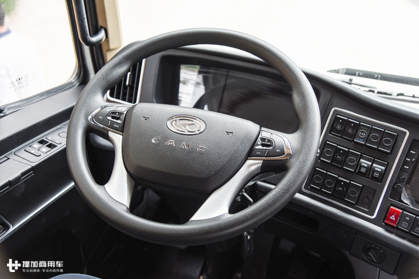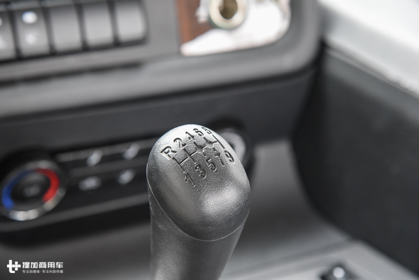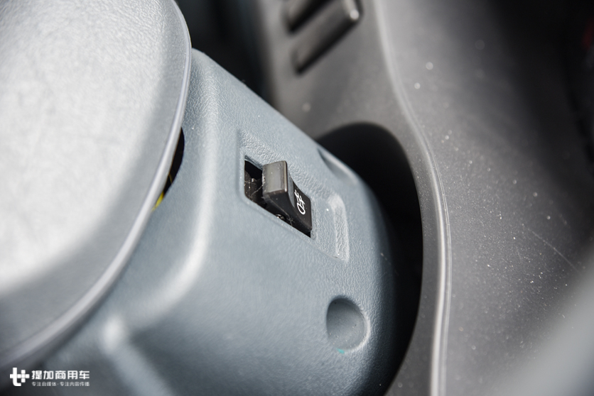 受限于驾驶室规格,发动机舱有巨大的凸起,侵占了车内中部空间,因此主副驾驶之间被完全隔断,所有的按键与操作都以驾驶员为中心,物理结构上实现了“环绕”。凸起部分做了一些造型设计的功能划分,使这一大块空间看上去整齐有序。驾驶员侧从前往后依次是换挡杆,后视镜加热、日行灯等功能按键,电源接口,手刹,储物格和杯架。