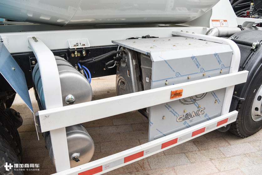 上装部分是华菱星马最拿手的部分了,做工和功能设计经过了多年的市场认证。虽然是四轴搅拌车,罐体容积却不大,公告的理论搅拌容积是7.3立方,比其他城市超大罐体的搅拌车要和谐许多。