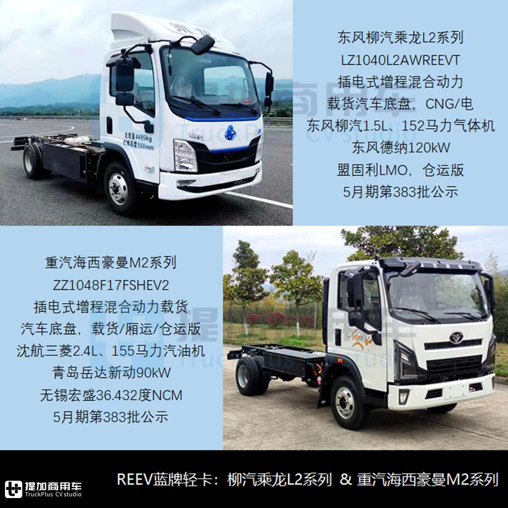 - 东风柳汽5月期申报了乘龙L2系列LZ1040L2AWREEVT插电式增程混合动力载货汽车底盘,以及仓运版整车。该车是继大运祥龙后、业内第二款CNG/电混合动力的增程式4.5吨轻卡,CNG气瓶左右轴间侧置,匹配自用1.5L、152马力气体机(新款机型),搭载东风德纳120kW电驱系统,盟固利LMO动力电池,形成整车后箱长4.2米、额定载质量1.25/1.1吨,限速90km/h。该底盘在6月期“二进宫”重新申报,亦可知此类新兴车型对行业确属新鲜事物。