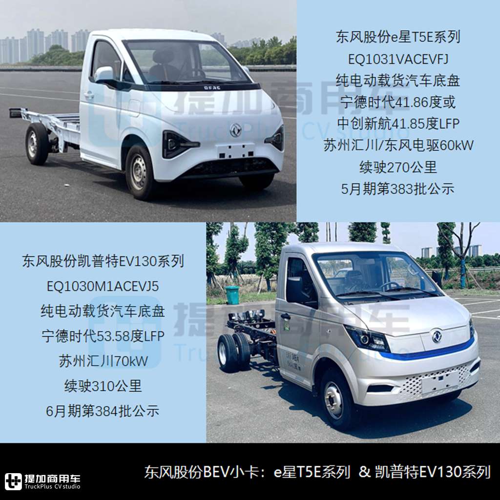 - 首先是5月期申报的东风e星平台,包括VAN类客厢和尖头小卡两款基本型。后者即T5E系列EQ1031VACEVFJ纯电动载货汽车底盘,GVW=3吨、轴距3.4米,后单胎驱动、175/185/195号轮胎,搭载宁德时代41.86度或中创新航41.85度LFP动力电池,苏州汇川或东风电驱动60kW电驱系统,与两款载货版整车同期申报公告,对应两种GVW=2775/3000kg和额定载质量1245/1470kg,最高90km/h,续驶270公里。
