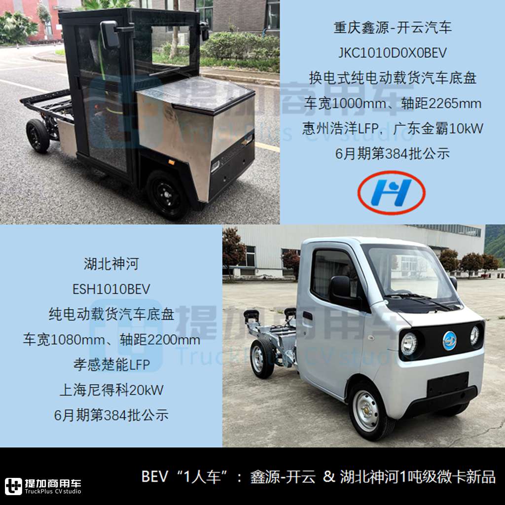- 湖北神河6月期申报了ESH1010BEV纯电动载货汽车底盘,以及载货/厢运版整车,更接近传统微卡的“大眼萌”风格、主打简洁实用。该底盘宽1080mm、轴距2200mm,后单胎驱动、135号轮胎,搭载孝感楚能LFP动力电池,上海尼得科20kW电驱系统。形成整车后,载货版采用三面可开的栏板结构,厢运版长1860/1800mm、容积2.55/2.38立方米,与快递三轮车规格相当,额定载质量415kg,最高均为71km/h。
