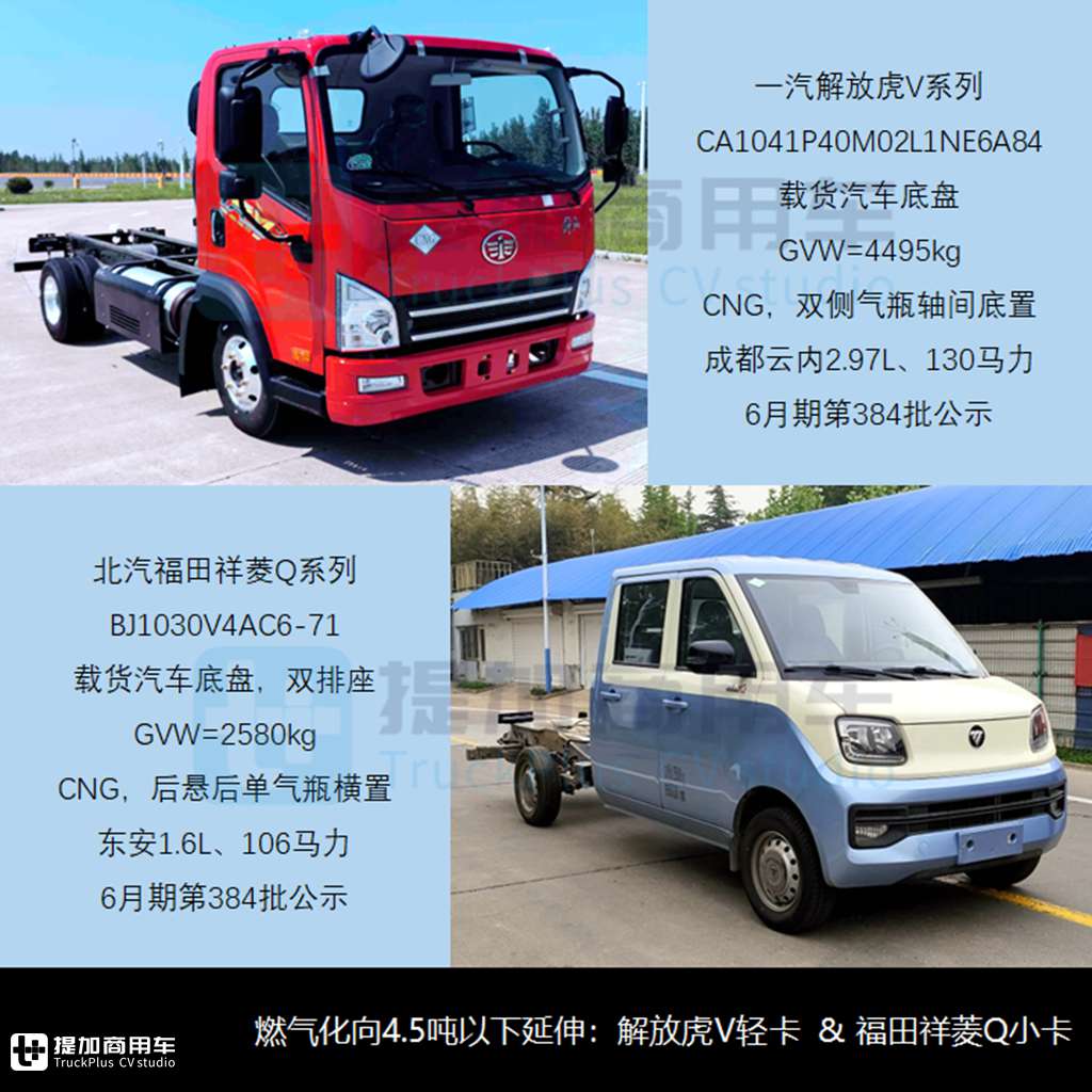今年二季度4.5吨以下的LCV燃气新品共计28款、极具规模效应,基本为CNG动力方案,主要有北汽福田、长安跨越、江淮系和一汽、鑫源、凯马等企业,覆盖GVW=2460-4495kg的多种规格,成为又一“燃气热点”。以下以6月期两款新品为例,进行简要说明。