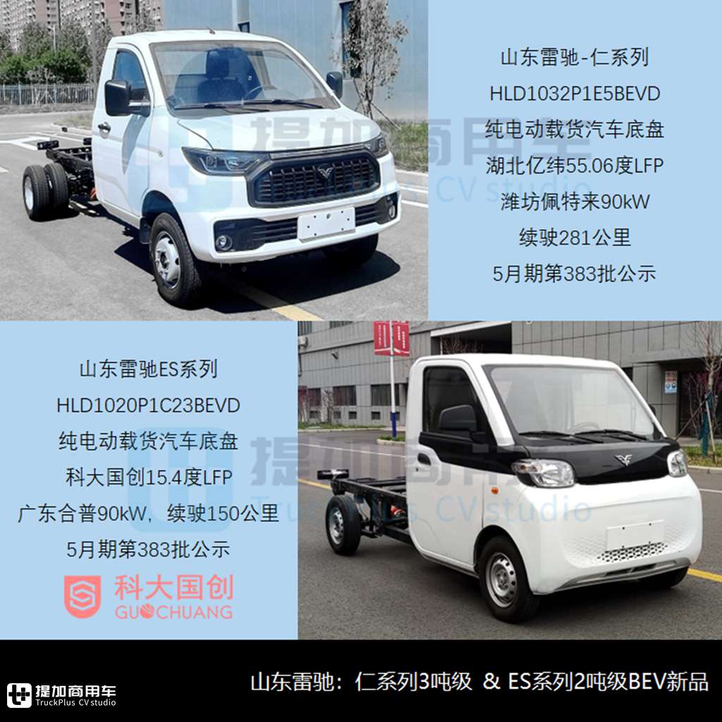 - 首先是雷驰-仁系列HLD1032P1E5BEVD纯电动载货汽车底盘,即此前的北汽制造五角星T1系列,宽1810mm、准乘2人,GVW=3495kg、轴距3.6米,后双胎驱动、185号轮胎,搭载湖北亿纬55.06度LFP动力电池,潍坊佩特来90kW电驱系统,与载货/厢运/仓运基本型整车同期申报公告,最高80km/h,续驶281公里。