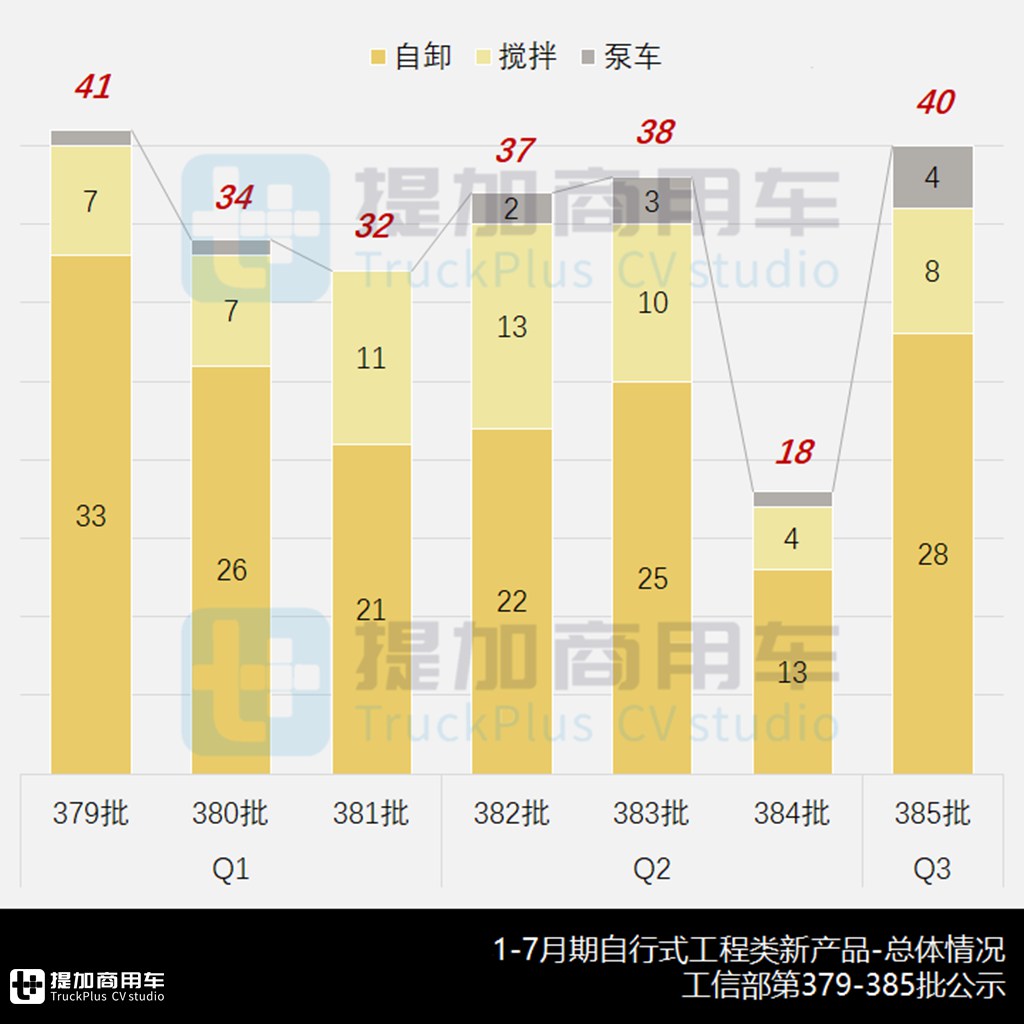 今年1-7月期,工信部第379-385批公示的自行式工程类新品共申报240款,其中上半年H1申报200款,月均33.3款可视为当前的基准水平。具体看: