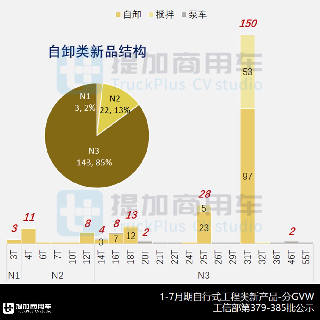 作为重型商用车辆的代表作品,按GVW≥12000kg统计,1-7月期的N3类新品合计215款、占比高达89.6%。其中核心产品为31吨8×4四轴新品,合计150款、独自占据超六成份额,97款自卸类和53款搅拌类在各自领域中也处于遥遥领先地位,突出“重中之重”的产品特征。其他细分GVW中相对突出的也都是重型车辆,包括28款三轴25吨和13款两轴18吨。